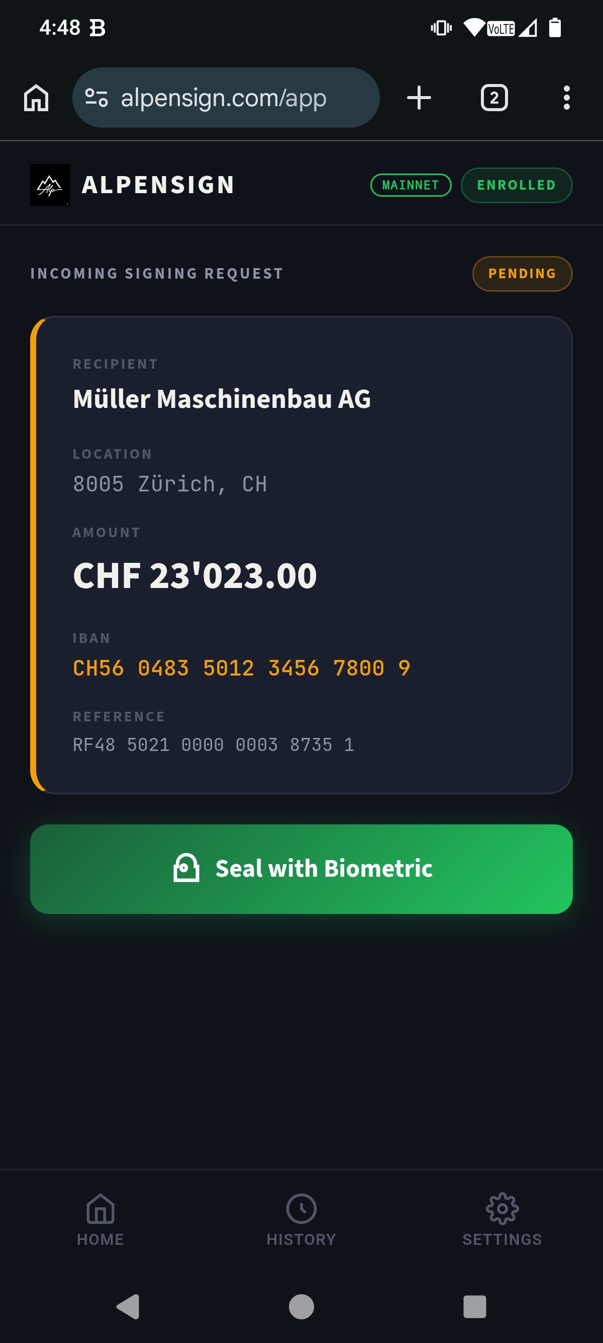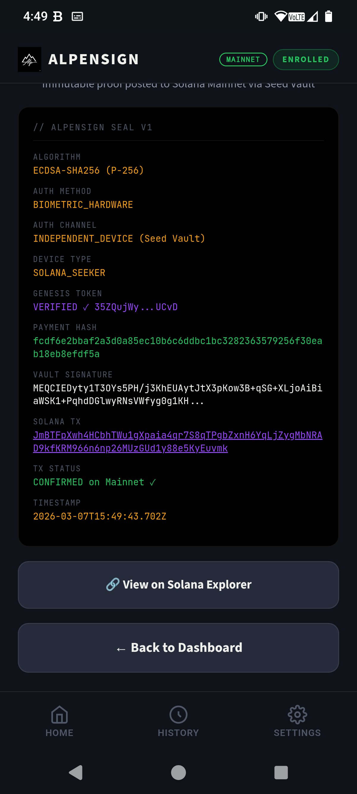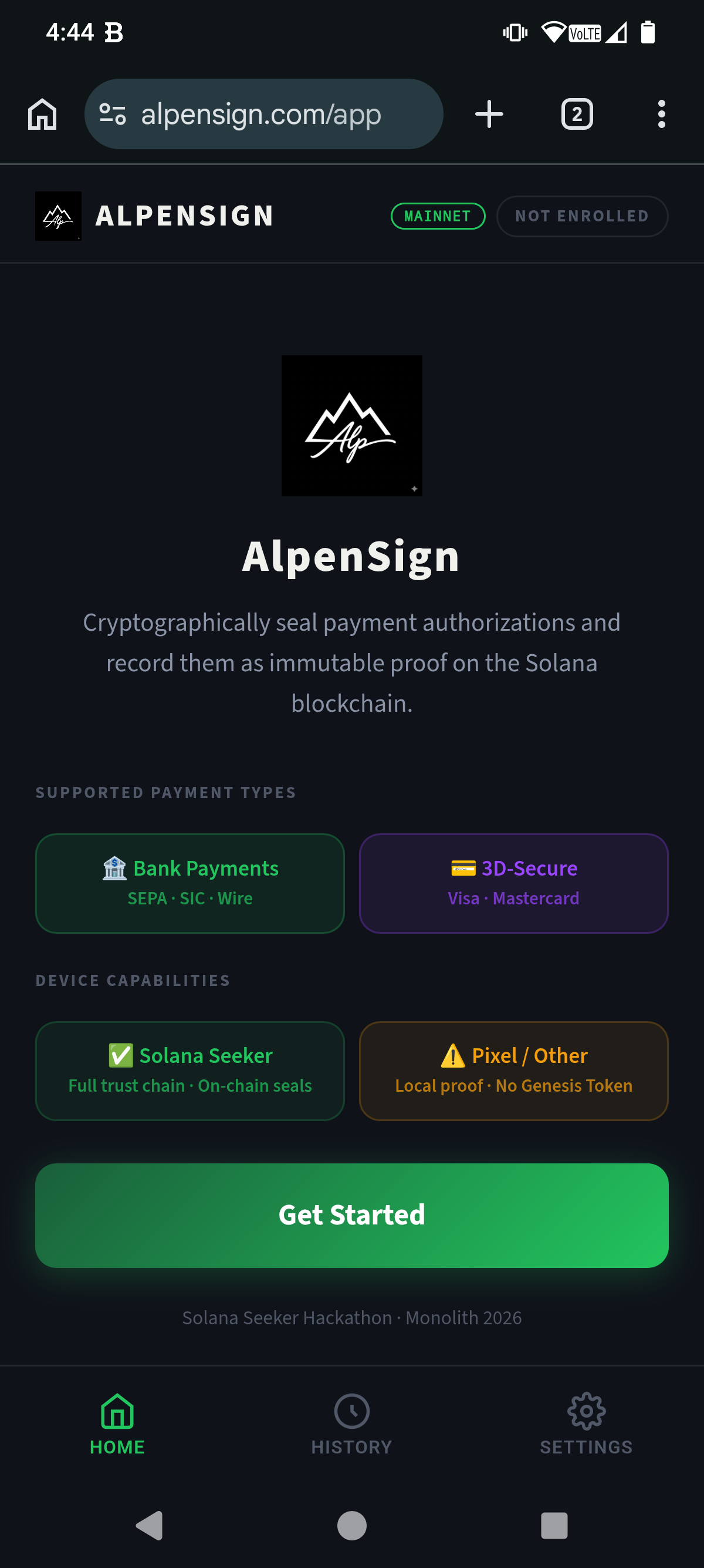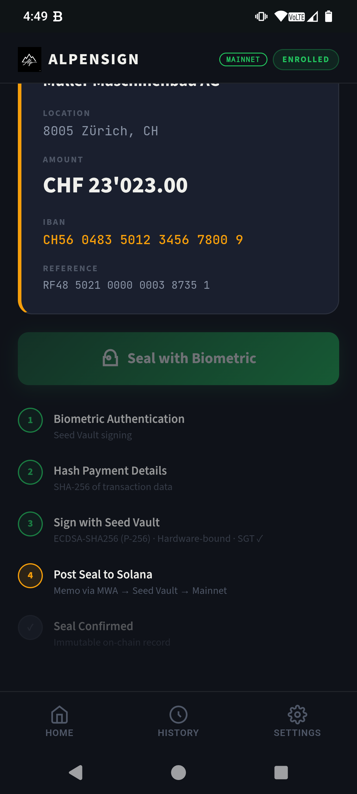 AlpenSign turns the Solana Seeker phone — a Web3-native smartphone with hardware-secured key storage — into a Mobile HSM — an independent, client-side device that seals bank payments and Visa/Mastercard 3D-Secure transactions with biometric confirmation and posts the proof to an immutable public ledger.